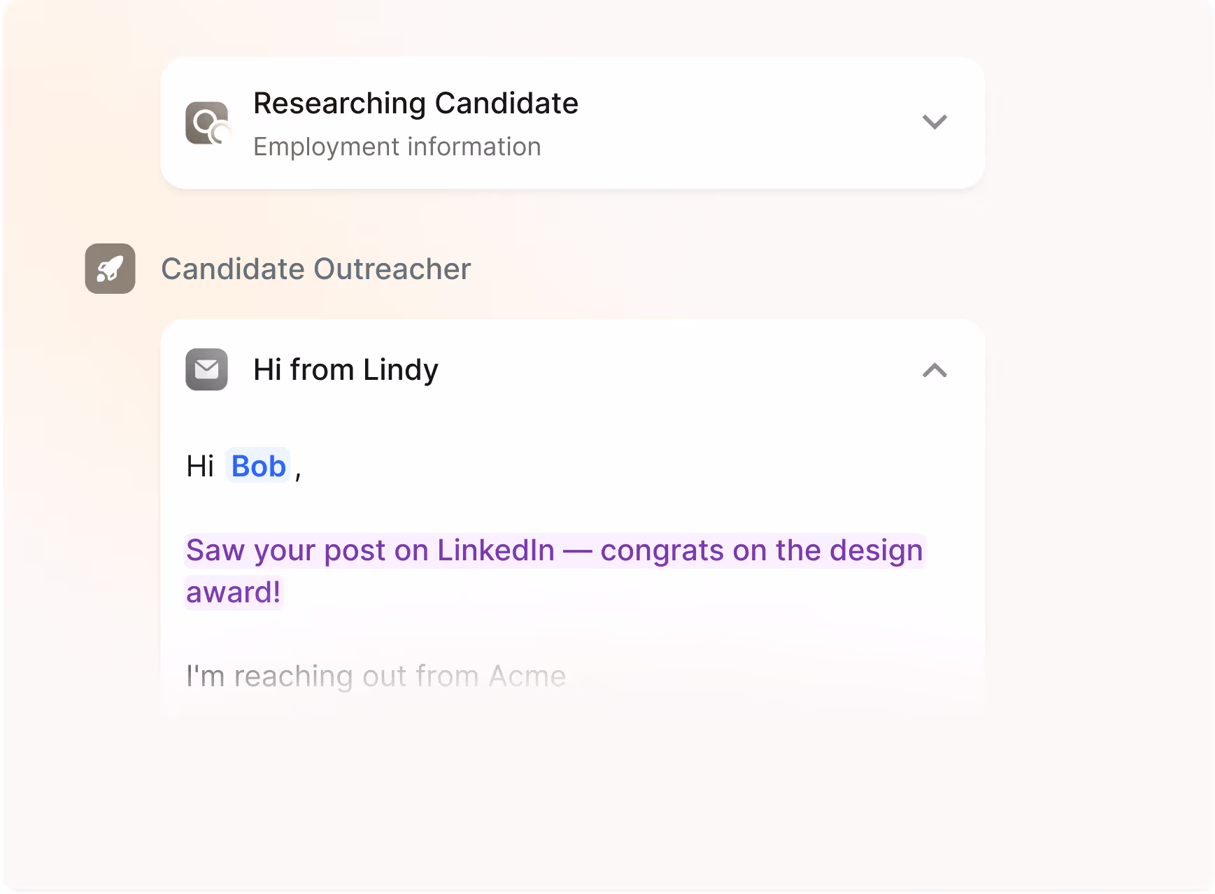 Enrich and engage. You AI agent researches each candidate's background to write personalized outreach messages that get responses, automatically adapting to their experience and interests.